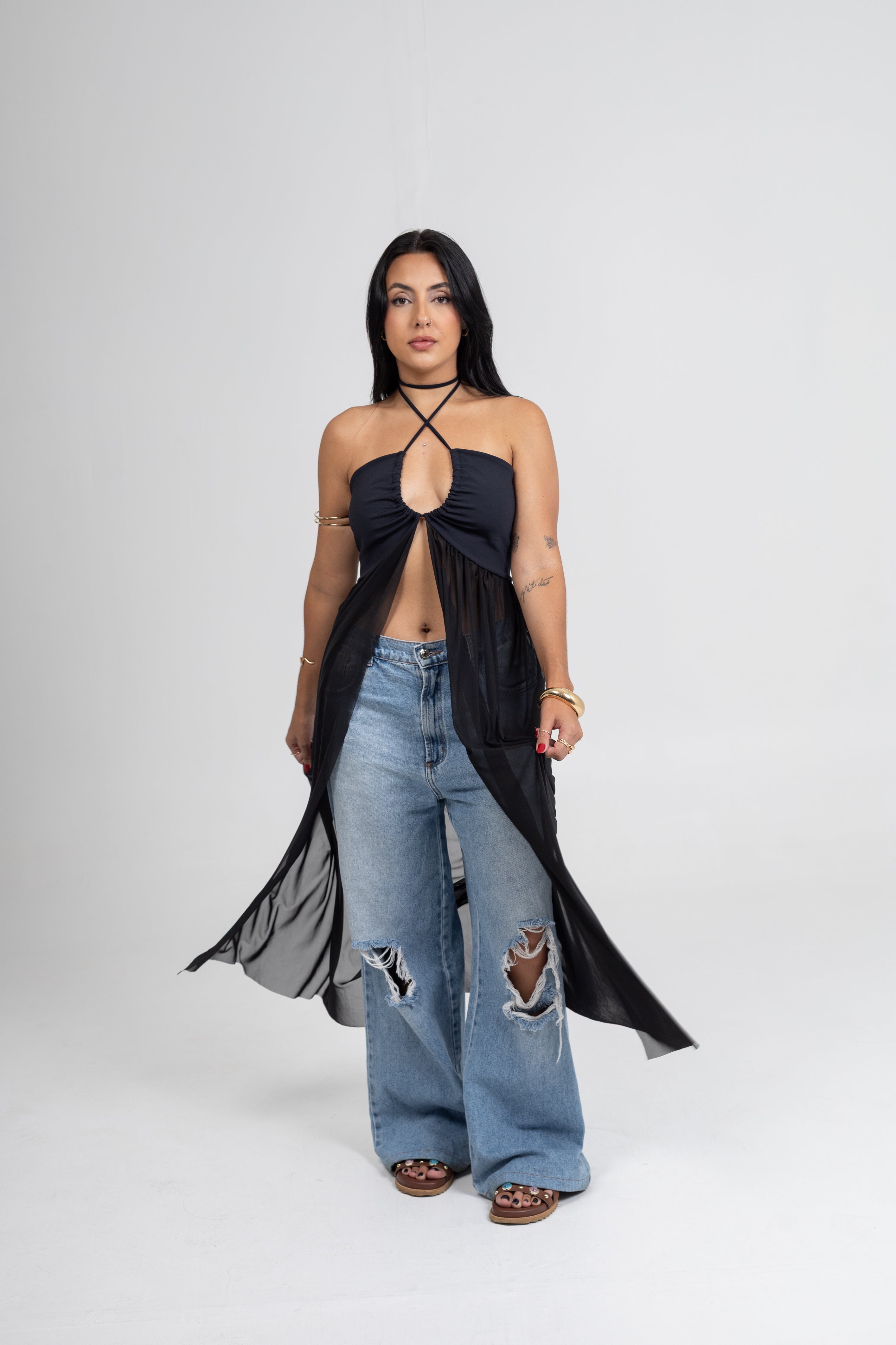 Suas tiras versáteis permitem diferentes amarrações — no pescoço ou no estilo tomara que caia — garantindo múltiplas propostas de estilo em uma única peça.