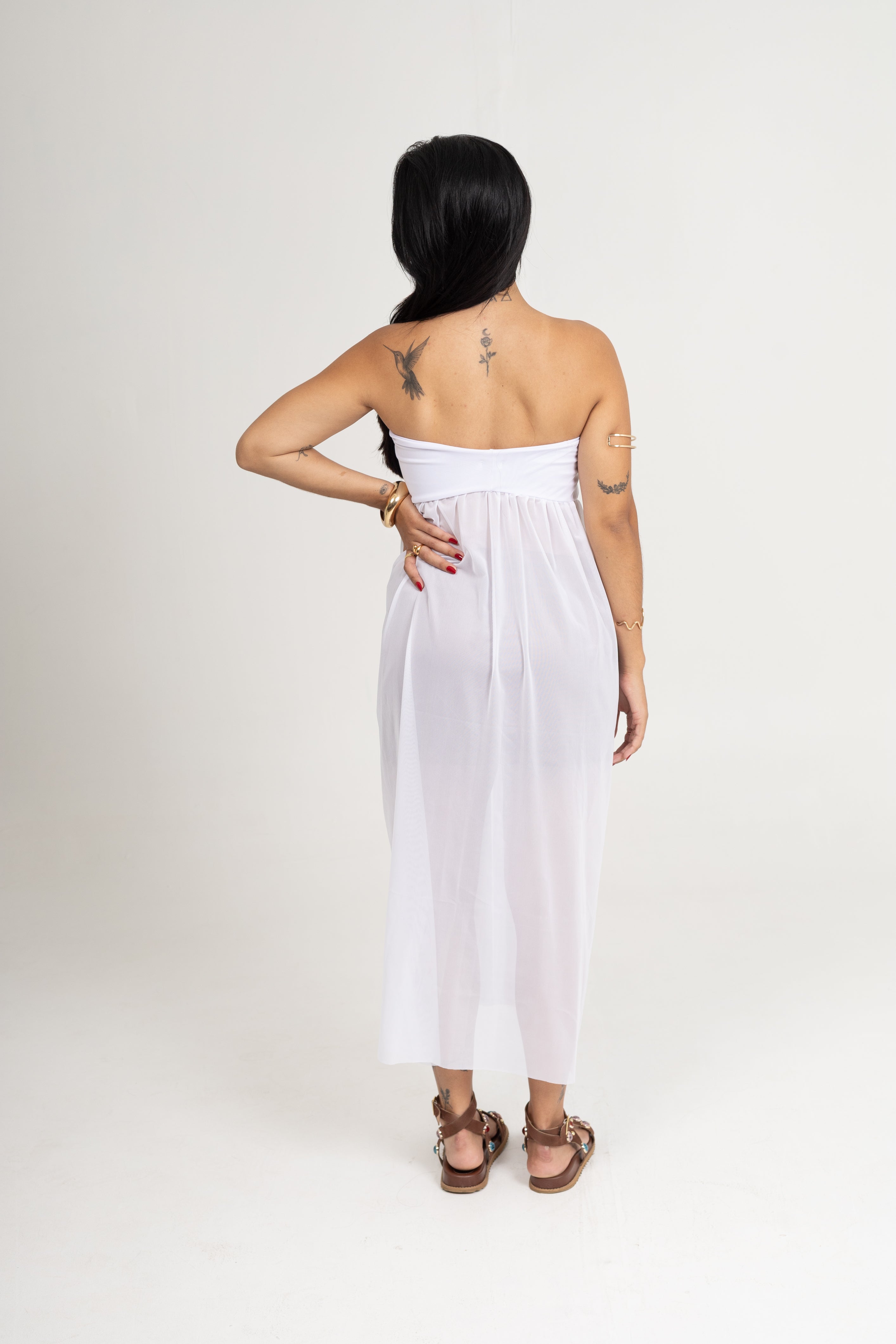A Bata Tule é uma peça ideal para composições sofisticadas de verão. Com design leva que caia e caimento fluido, ela combina transparência estratégica no comprimento com sustentação perfeita no busto graças ao forro interno em poliamida com elastano.